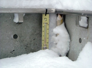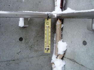 手すりにぶらさげてある温度計は雪に埋もれかかっています。