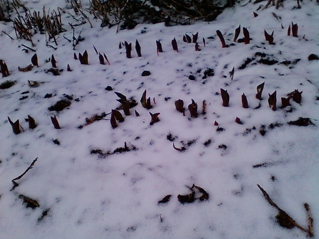 ここ何日かの暖かさで芽が出始めたチューリップ畑も、白く覆われてしまいました。しかしこの雪も昼になるにつれ解け出しています。
